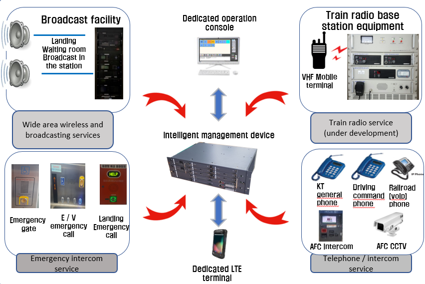 A large number of facilities such as wide-area radio broadcasting, intercoms, telephones, AFC images, and emergency gate control that are in operation in Station Offices of wide-area trains are integrated and managed in one equipment, and managed through a dedicated LTE terminal when staffs are absent. A system that integrates / manages the work of station office